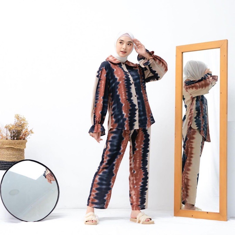 AMOLLA SET Rp 117.000/Item[FOTO DIATAS ADALAH REALPICT 100% DARI KAMI]Matterial / Bahan : Rayon UniqloAvaiable colour : Coklat / On ModelDetail Model Atasan :✔️Kancing Depan Full Aktif dengan kancing Batok ( Busui Friendly ) ✔️Tangan kerut bunga✔️Lengan Puffy / Balon✔️Kerah OvalDetail Celana :✔️Pinggang Full Karet✔️Ada Tali pengatur______________Deskripsi Size Atasan : LD ( Lebar Dada ) : -/+ 110cmPJ Baju : -/+ 70cmLingkar Ketiak : -/+ 50cmPj Tangan : -/+ 55cmDeskripsi Size Celana :Panjang Celana : -/+ 95cmLingkar Paha : -/+ 70cmPanjang Pasak : -/+ 35cmLingkar Pinggang sebelum melar -/+ 60cm , Bisa Melar sampai -/+ 100cmBerat : 36
