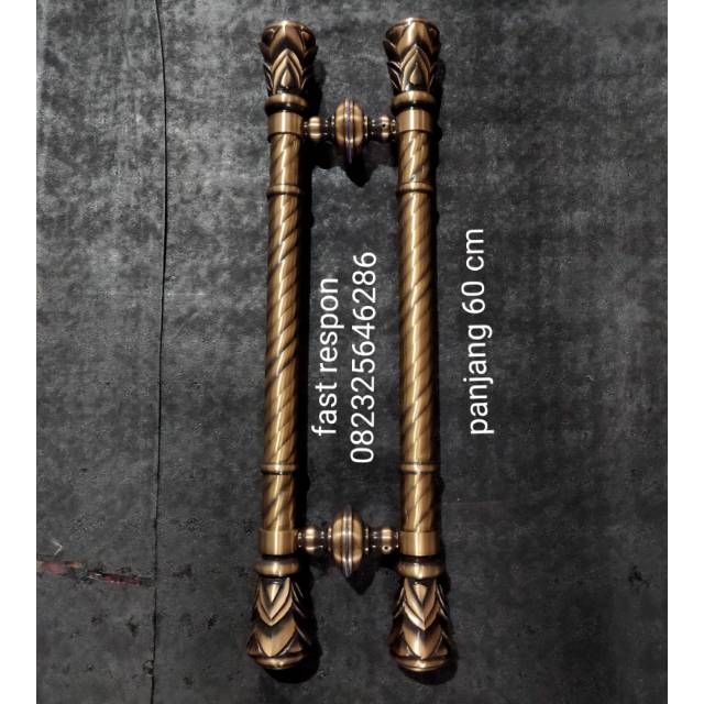 Bahan kuninganFinishing antikPanjang 60 cmJarak kaki ke kaki 40 cmSistem kaki kaca ( baut + kunci L )Untuk pembelian item ini,agan menerima sepasang 2 pcs handleSilahkan klik tombol BELI untuk bertransaksi, shopee transaksi online aman,nyaman dan terpercaya. DI JAMIN 100 %Jika ada yang mau di tanyakan jangan sungkan untuk mengontak STOCK Untuk menghindari refund (pengembalian dana), mohon sebelum melakukan pemesanan, silahkan hubungi kami terlebih daluhu untuk memastikan Stock Produk tersedia. Cara menanyakan Stock, bisa melalui Tinggalkan Pesan pada produk yang Anda maksud.PACKING & PENGIRIMAN Pengiriman dengan packing kardus tebal dan diberi gumpalan kertas koran bekas, tahan goncangan, sehingga aman sampai tujuan. Pengiriman dilakukan setiap hari, kecuali tanggal Merah pada Kalender. Khusus hari Sabtu, pengiriman hanya dilakukan pada pagi hari, jadi Orderan yang masuk hari Sabtu setelah jam 9 pagi, akan dikirim pada hari Senin (hari Minggu agen JNE tutup). Kami hanya mengunakan JNE untuk pengiriman. Jika Anda memilih JNE layanan YES (Yakin Esok Sampai), belum tentu barang yang Anda pesan sampai ke alamat tujuan dalam waktu 1 hari. Jika Orderan masuk ke kami sore/malam hari, tentu kami kirim keesokan harinya. Jika barang yang diorder masih proses produksi, kami akan segera kirim & respon orderan Anda secepa