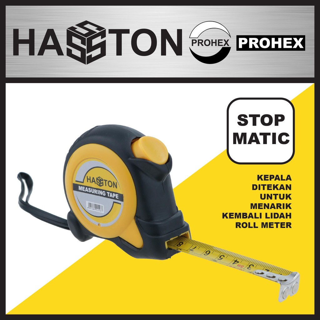Meteran 5 meter Hasston Prohex 3420-016Ukuran 5 M x 19 mmBahan platnya lebih tebal dari merk biasaBahan cover dilindungi karet sehingga tidak mudah pecah saat terjatuh(Magic stop) Tombol ditekan untuk menarik lidah rol meteranNB : Harap cek ketersediaan stok dah