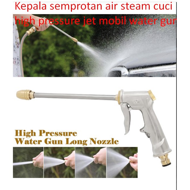 Kepala semprotan air steam cuci high pressure jet mobil water gunDengan kepala semportan air ini anda dapat menyemprot air dengan kuat dengan cara menekan tuas maka air akan keluar dengan kencangDimension150 x 290 mmMaterialZinc alloy(body) + Copper(Nozzle head) + Zinc alloy(hand