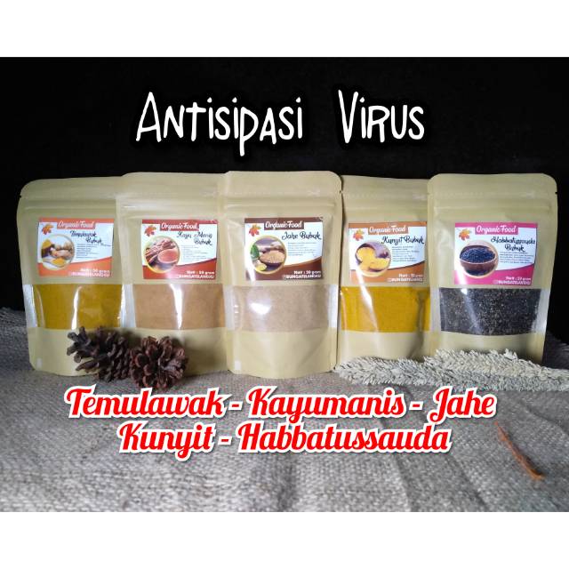 Maraknya virus dimana-mana, sudah seharusnya kita butuh pertolongan, at least sebagai antisipasi menghadapi virus2 berbahaya, tanaman2 yang Allah tumbuhkan diatas muka bumi ini, ternyata sangat berguna untuk menangkal virus ini.ada jahe, kunyit, temulawak, kayu manis dan habbatussauda. kemasan bubuk. dan ini ASLI tanpa campuran,..diantaranya- Jahe emprit, khasiat seperti jahe merah (maaf foto blm diganti)- Kunyit- Temulawak- kayu manis- habbatussa