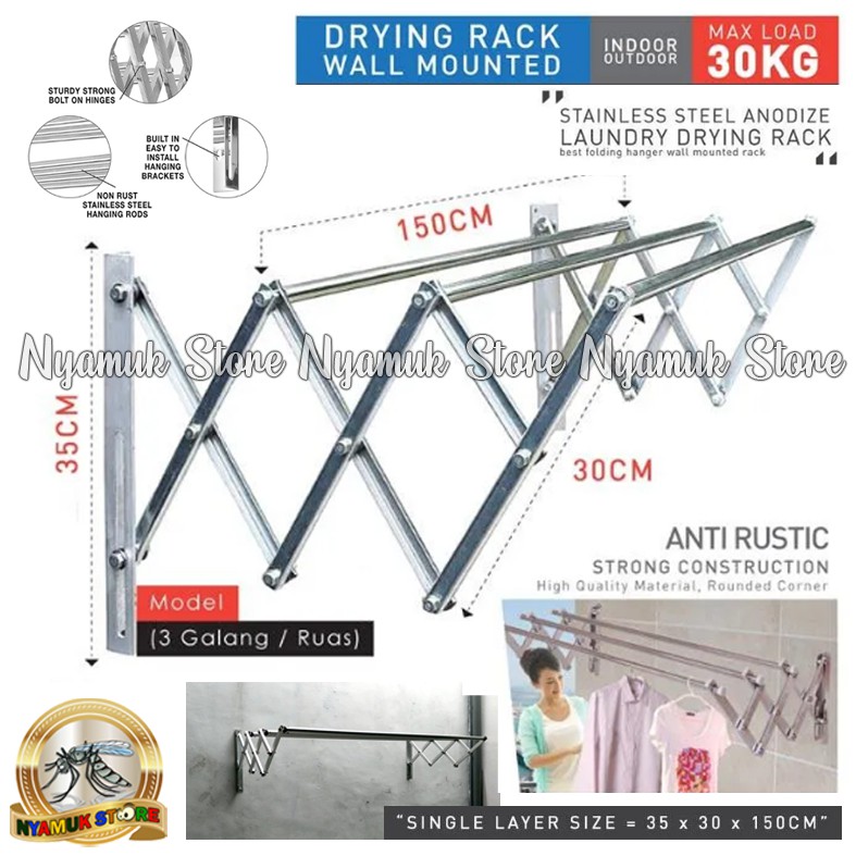 - 3 GALANG SIZE 150 x 35 x 30CM- WALL MOUNTED FOLDABLE DRYING LAUNDRY RACK INDOOR / OUTDOOR- SIMPLY PULL IT OUT FOR HANGING, OR PUSH IT BACK WHEN NOT IN USEDESKRIPSIWall Mounted Foldable Drying Laundry Rack / Jemuran Dinding Pakaian 3 Tier / 3 Galang merupakan rak jemuran dengan sistem gantung di dinding, rak jemuran ini terbuat dari bahan plat stainless steel anti karat dengan finishing anodize serta dengan border siku rounded yang aman untuk Anda. Rak jemuran ini mudah dipasang hanya cukup memasang fisher pada dinding Anda. Rak gantung ini dapat juga dapat dilipat sehingga tidak memakan banyak ruang di dinding Anda. Selain itu wall mounted drying laundry ini dapat menopang beban sampai 30Kg.FEATUREWall mount accordion drying rack has nine rungs for eighteen feet of air drying spaceUse to air dry clothing fresh from the washJust find the perfect spot and use the included hardware to lock into placeMade of durable steel with a white finish3 tier / tube designHigh quality material and good finishingSturdy design, easy to installHuge drying capacity with heavy weight capacityFolding accordion drying rack mounts on walls for air drying wet clothes and towelsSPESIFICATIONSBrand : Made In ChinaModel : Wall Mounted Drying Laundry Rack (3-Tier)Tier / Tube / Galang : 3Material : Stainless Steel With Anodize FinishingMax Load : 20-30kgSize : 150 x 35 x 30 (P x L x T)Bold Corner Material : 3 x 3cmBold Diameter Tube : 5cm x 1mmAnti Rust SteelEasy To InstallHigh Precision QualityPACKAGE INCLUDED1 x Set Wall Mounted Foldable Drying Laundry Rack / Jemuran Dinding Pakaian 3 Tier / 3 Galang☑️ Barang kami ready stock.☑️ Informasi pengiriman silahkan cek catatan / banner di halaman utama toko kami :)☑️ Beli = Se