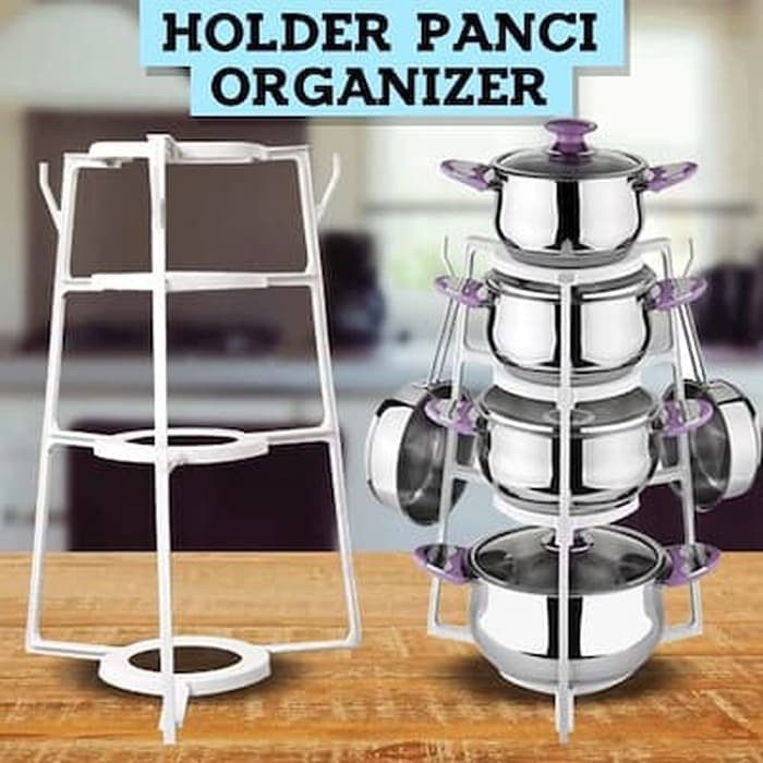 Punya banyak panci ?? Bingung mau disimpan dimana ?? Panci jika tidak disimpan dengan baik, ruang lemari dapur jadi sempit, perkakas dapur jadi terlihat berantakan.Gak perlu bingung, solusinya dengan holder panci. Holder panci adalah holder berbentuk tangga 4 susun yang mampu menyimpan hingga 14 macam peralatan masak.Anda dapat menyusun peralatan masak seperti panci, teflon, teko, piring dan sejenisnya ke dalam holder. Di bagian samping holder juga terdapat cantolan, bisa untuk gantungan peralatan masak.Holder panci dapat disimpan di dalam lemari atau diletakkan di meja dapur. Dengan holder panci, peralatan dapur jadi tersimpan rapi, menghemat ruang lemari.Size :Diameter susun paling bawah : 33 cmDiameter susun paling atas : 21 cmTinggi : 50 cmMaterial : Plasti