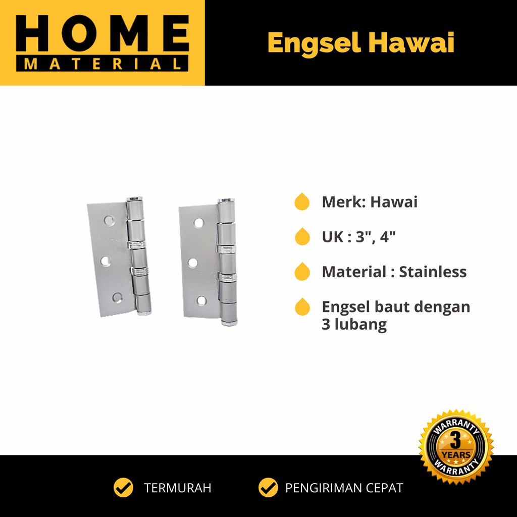 PALING MURAH !!!Engsel Pintu / Jendela- Merk : HawaiiTersedia 3 / 4 Inch - 3 Inch- Engsel baut 3 lubangnya- Panjang 3" inchi atau real nya 2⅞" inchi / 7,5 cm- Lebar 2,5" inchi atau real nya 2⅜" inchi / 6 cm- Tinggi / Diameter as lingkaran 1,1 cm- Ketebalan plat besi 2,5 mm atau realnya 2,2 mm- 4 Inch- 4”x3” (10cm x 7.5cm)- Tebal : 3 mm- Penggunaan untuk Jendela / Pintu- Produk import jaminan kualitas super bagus- Kualitas produk sangat baik tidak mudah turun, lancar tidak seratBarang 100% sama seperti di gambar , karena di foto langsung dari barang stok yang ada.*DENGAN MEMBELI PRODUK INI BERARTI SETUJU DENGAN SYARAT DAN KETENTUAN DIATAS*Semua barang di etalase kami selalu ready baik Qty ecer maupun partai, silahkan langsung pesan agar segera dapat diproses kirimInfo & Ketentuan toko :(BELI = MEMBACA & SETUJU)1. Pengiriman SETIAP HARI senin - jumat (terkecuali hari libur & tanggal merah)2. Close order terakhir print pada Pk 13.00 siang, pesanan yang masuk diatas itu akan lanjut diproses esok hari (Termasuk pengiriman instant dan sameday)3. Masa kemas toko tercepat adalah 1 hari, Termaksimal 2hari pengemasan (terkecuali ada event / campaign tanggal cantik seperti 1.1 2.2 3.3 gratis ongkir) - Diproses sesuai dengan urutan pesanan yang masuk terdahulu4. Mohon video pada saat unboxing paket secara utuh belum terbuka, Jika tidak ada lampiran bukti video, mohon maaf komplain ditutup dan tidak dapat dibantu5. Pesanan sudah kami QC baik jumlah maupun kualitas, (kasih note pilihan warna alternatif, jikalau kosong kami akan memberitahukan melalui fitur chat dan kami tunggu respon 1X24 jam, tidak ada respon chat maka warna akan kami ganti dengan warna yg mirip/ random)6. Di tunggu order berikutnya ajakin temen dan keluarga ya!YUK BURUAN DI ORDER SEBELUM KEHABISAN !!!TERIMA
